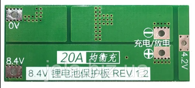 Контролер BMS 2S 20A с функцией балансировки предназначен для сборки батарей на два литиевые элемента (2S, 7.4–8.4V).