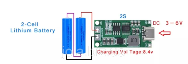 Модуль DDTCCRUB 2S2A Type-C предназначен для зарядки сборников литий-ионных или литий-полимерных аккумуляторов типа 2S (7.4–8.4 В).