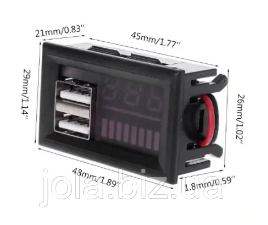 Прибор показывает уровень заряда в процентах и текущее напряжение батареи, а также оснащен USB выходом 5В/2А, который подходит для зарядки телефонов, планшетов, павербанков, GPS-навигаторов и других устройств.